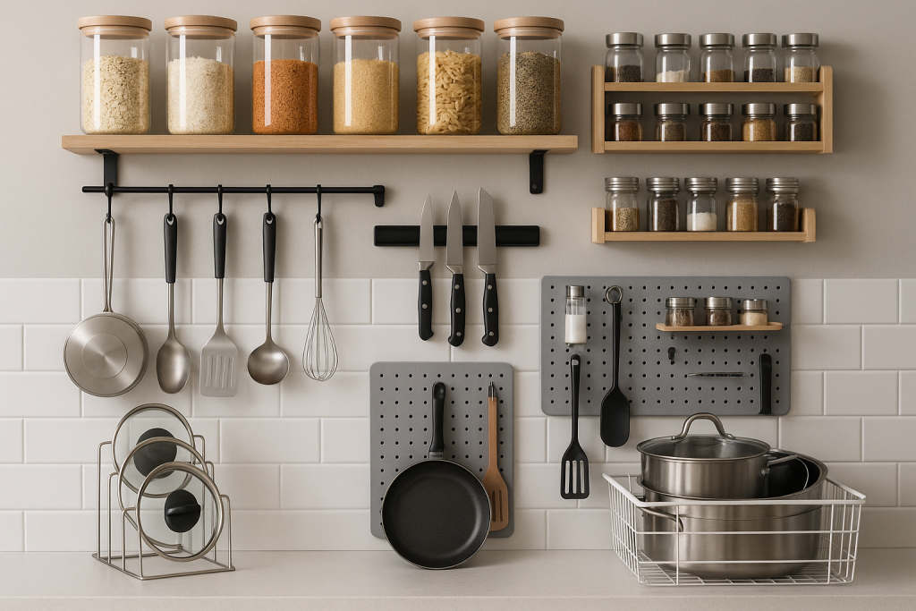- Перфорированные панели (пегборды). Установите на стену перфорированную доску и используйте крючки для размещения сковородок, кухонной утвари и даже мелких полок.